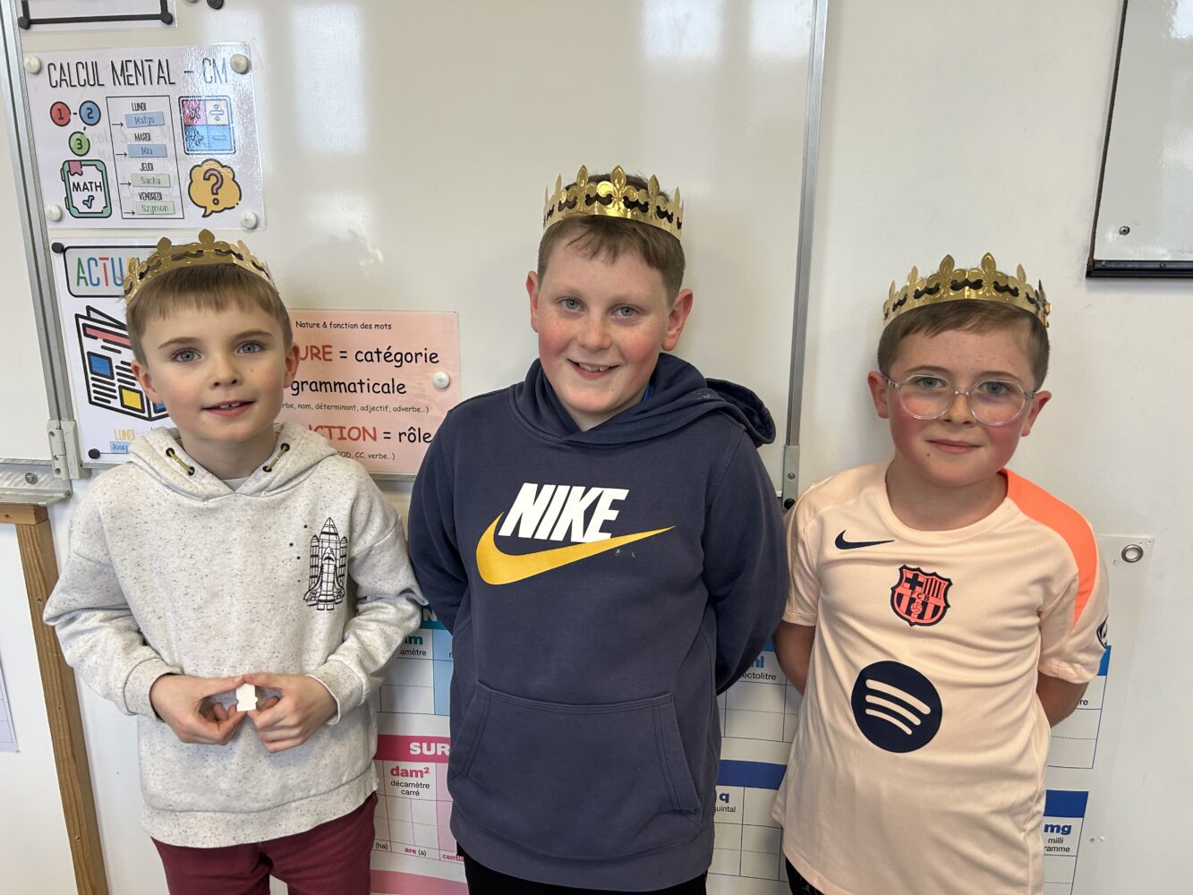 Nos Rois mages Balthazar ? Melchior ? Gaspard ? Mais non ! Ce sont bien nos camarades Sacha, Lucien et Lïano, qui ont trouvé une fève dans leur part de galette, à l’occasion de l’anniversaire de Jules.