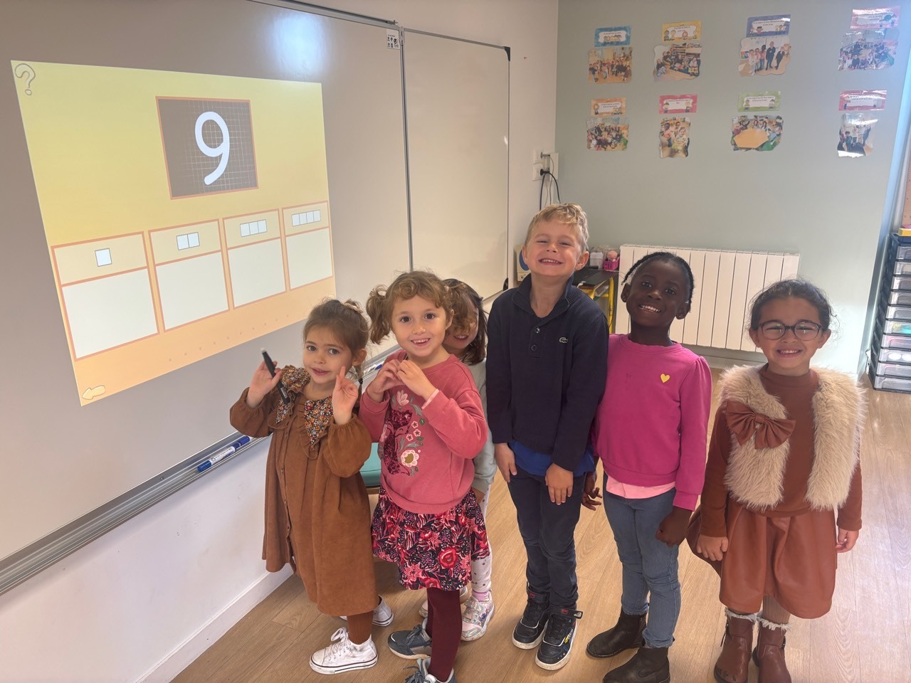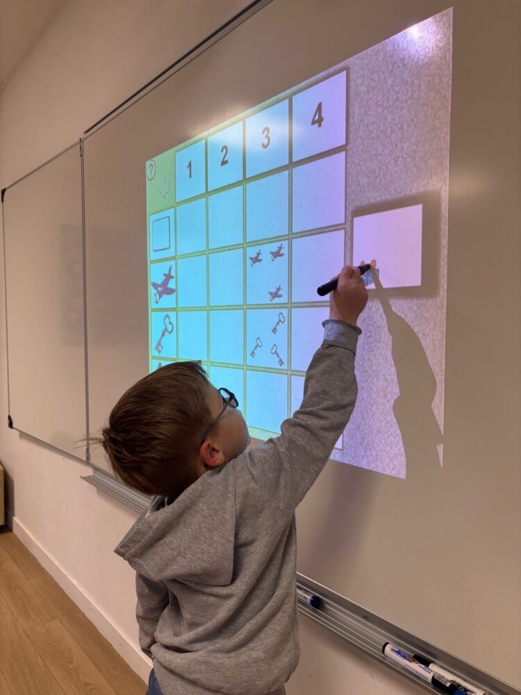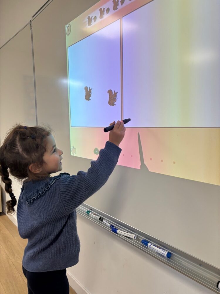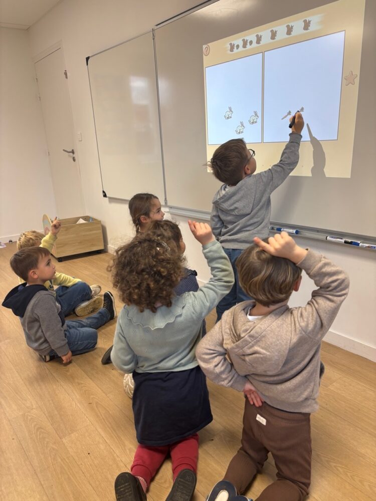 La classe dispose d’un tableau intéractif qui nous permet de travailler sur plusieurs domaines. Par exemple des exercices de phonologie, de mathématiques (numération, repérage dans l’espace) ou des petits jeux comme le mémory !